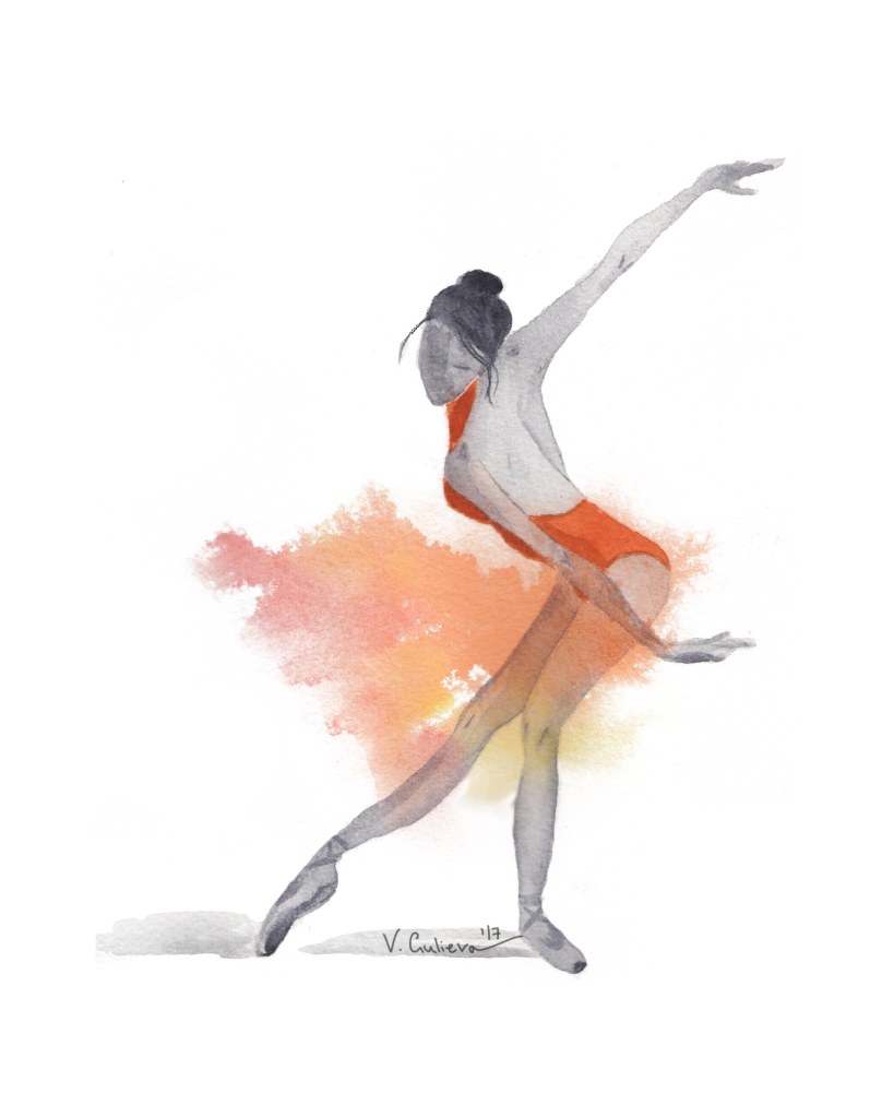 I somehow came back to where I started – ballet dancers. Planning to make a few more for a small poster/postcard series. I really like these gracious shapes, and there is quite some room for experimenting with the materials. For example, this cloud of colour surrounding the figure is quite thickly applied paint further spread by a sprayer. Yes, I just paint on paper and then I spray on top, and it moves in funny shapes – will definitely try more of this technique.