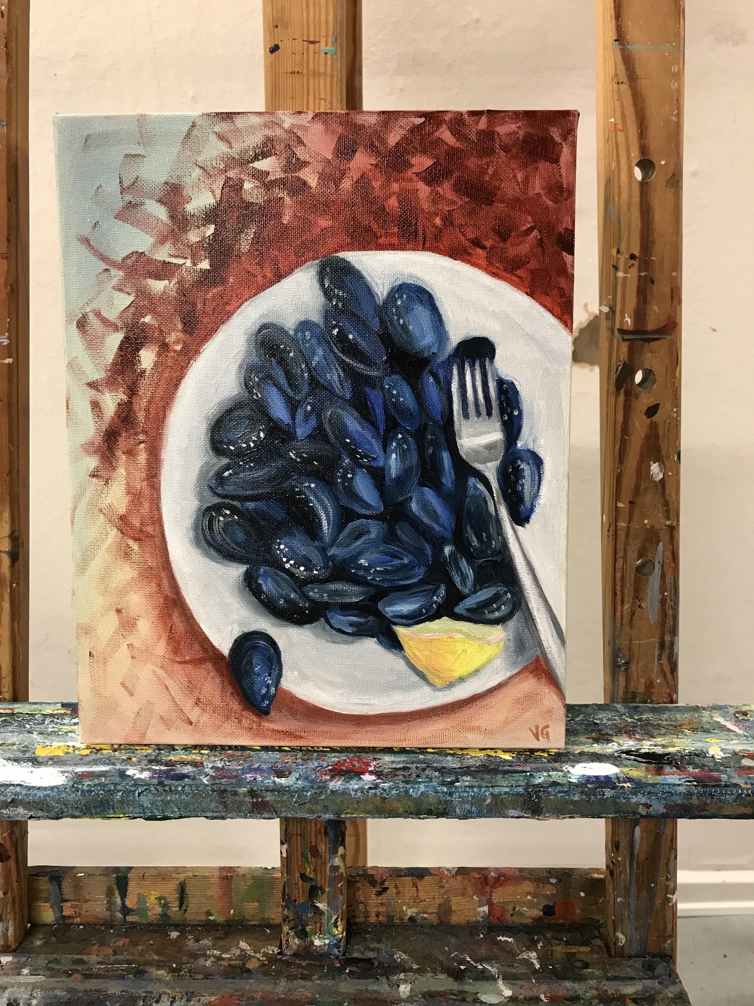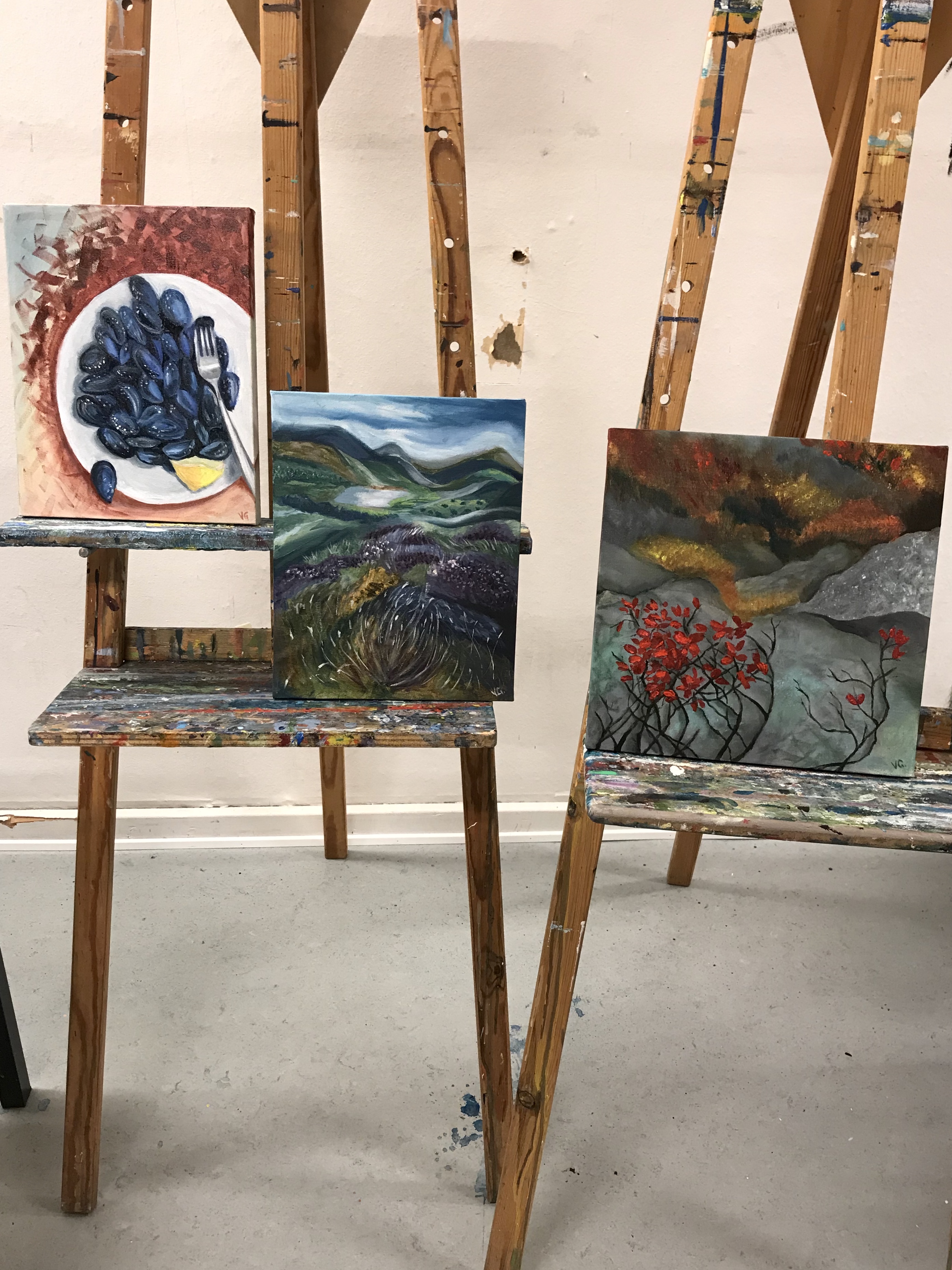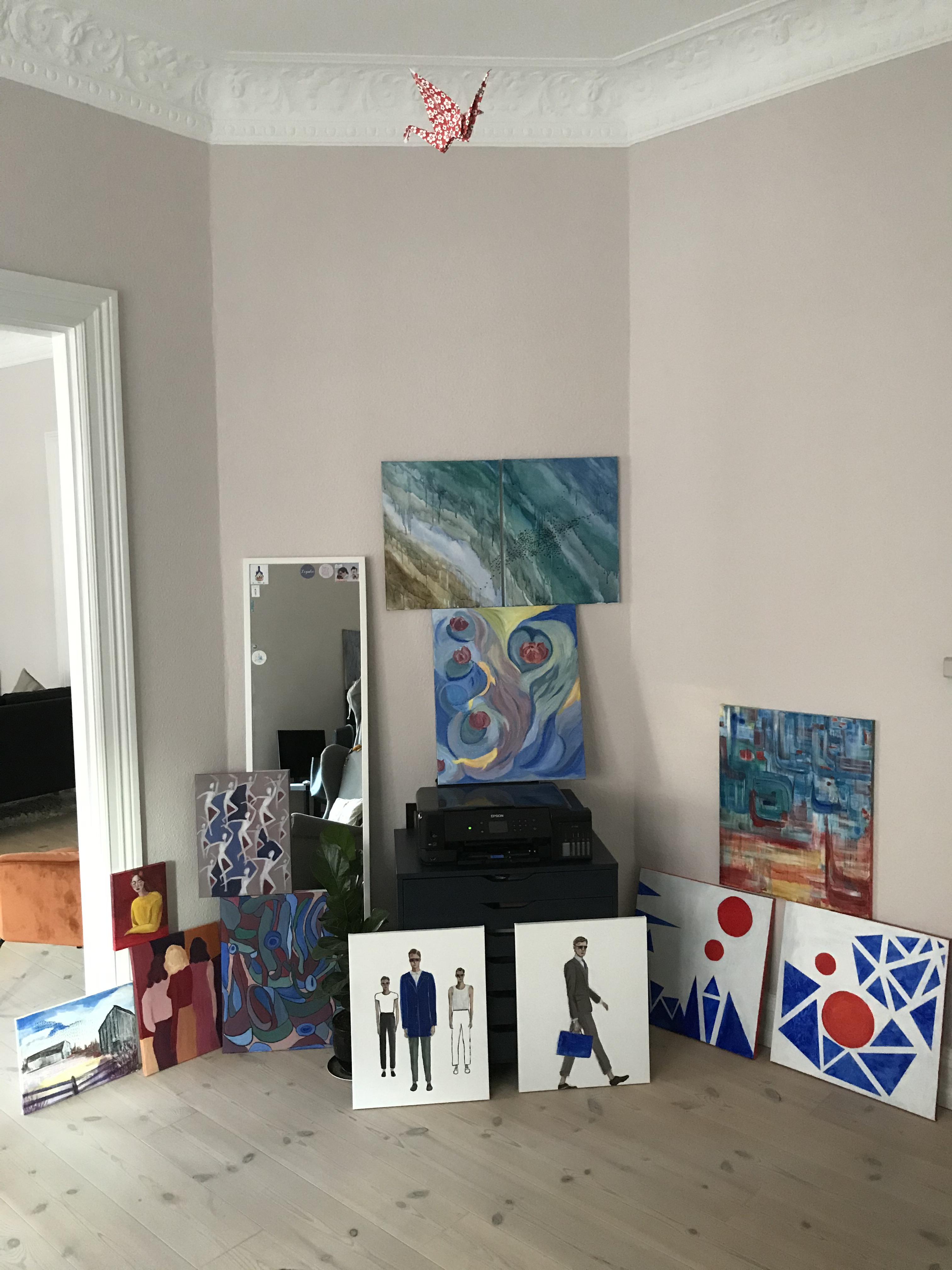In autumn 2019, I decided to go back to school again and learn to paint on canvas. I had a sort of inferiority complex because I thought canvases were for big artists, and until then, I had only worked on paper with watercolor and printing. So I felt very excited and intimidated at the same time. At that point, I had my basics and knew how to draw and paint, so I could focus on the medium and actually learn to do it. I finally tried oil—it’s the yummiest paint to work with, but also the most capricious. I had a very nice teacher, Henrik. By then, I spoke quite fluent Danish, so I could keep up. It was a very rewarding course, but unfortunately, it was cut short by the pandemic, and after that, I never returned to regular courses. Now that I think about it, I also took a ceramic course in the same type of school. It was interesting, and I really love the pieces that I actually made, but I went there to learn to use pottery wheel and I sucked big time at it. The teacher didn’t really have enough time for me because I was the only beginner in the group, so I felt continuously frustrated and couldn’t wait to finish the course. But instead of making proper cups I made small sculptures and now I think it was even better 🙂 sometimes I think that maybe it could be quite cool to try again, just tone down my expectations a little, go with the flow, and just enjoy it.