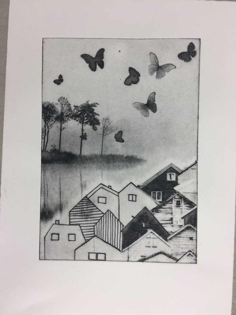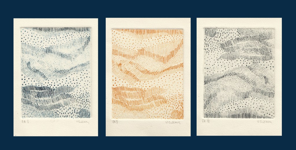 Then I got tired of watercolor.. and decided it was time to start something new. Like I said, I was very much into simplicity at that point, and it’s sort of hard to find a simpler or less sophisticated way of expressing yourself visually than linoleum prints. So I think for the next year, I was reading everything I could find and buying lots and lots of materials on Amazon. I felt very free and experimental, and I still like those works of mine. I will come back to lino at some point as well, even though, to be honest, I think cutting yourself regularly with very sharp tools is a type of entertainment that doesn’t suit everybody. I was so excited about printing techniques that in 2018, I spent my summer holiday at the Art Academy in London. I did a course in photopolymer and photoetching. It was amazing. I met many cool people, and I felt very free and excited – maybe also becuale I was dancing lindy hop to live bands pretty much every night too, hehe. It felt amazing. But the techniques I tried there required quite a lot of complicated equipment and special chemicals, so it was not exactly doable for me at home. Then two years later, in the midst of the pandemic, I went to a summer school in Denmark (it’s called højskole here). I did other types of printing again, less complicated than in London, but still not as home-friendly as linoleum. Maybe my third face-to-face printing course will finally be in lino. It is truly the most user-friendly and doable thing for home printing, and I love it for that.