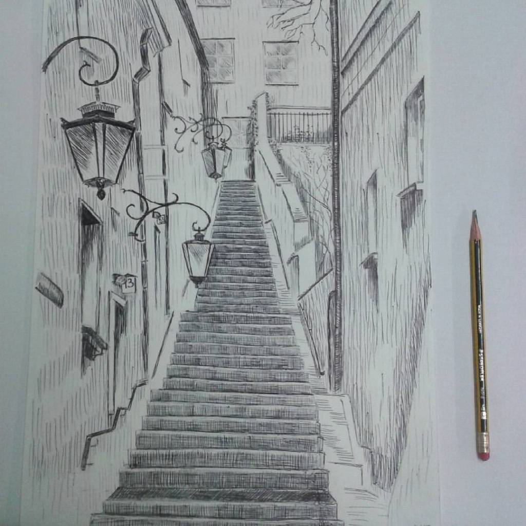 I joined an FOF course in Aalborg. It is an evening school for adults that has a variety of classes, from hobby subjects like arts to language courses and fixing furniture—anything you like. I had a great teacher named Peter, but unfortunately, my Danish then was very poor, and I barely understood even half of what he was trying to tell me. His phrase about drawing, “drawing is seeing,” still feels genius though. I think only now am I realizing the point of this phrase and can actually see some things clearly. It’s amazing how only after getting quite a lot of viewing experience and really staring at shapes for a long time, you start perceiving things much better and noticing things that you otherwise would never notice. I was dreaming of watercolor back then, but I quickly realized that to paint, I needed to learn drawing. So the first half a year in that school, I was doing a lot of graphics with a plain pencil and a black ball pen. I will attach a few examples. It’s funny, I used to be so much more patient than I am now; I worked on the same piece for several evenings and didn’t think it was weird or too slow. These days, I need things to happen much faster, and I really don’t like that about myself. So I went on for two seasons/semesters. It was about one full year of proper schooling. Later on, I took a few online courses specifically for watercolor. I was still fascinated.