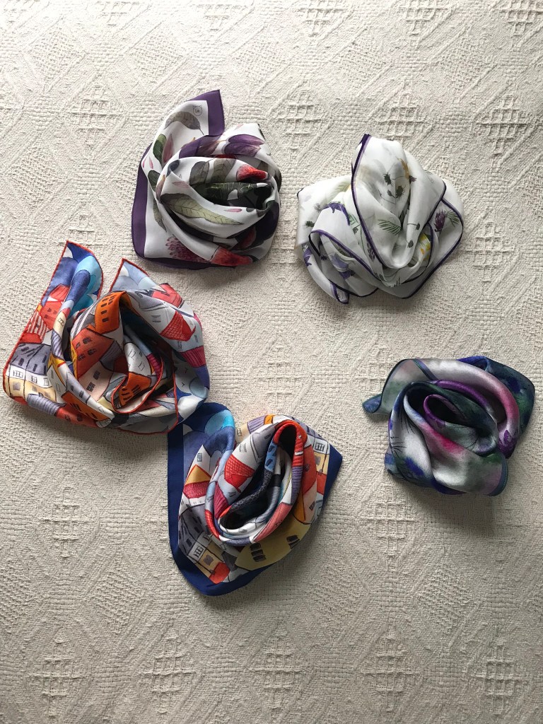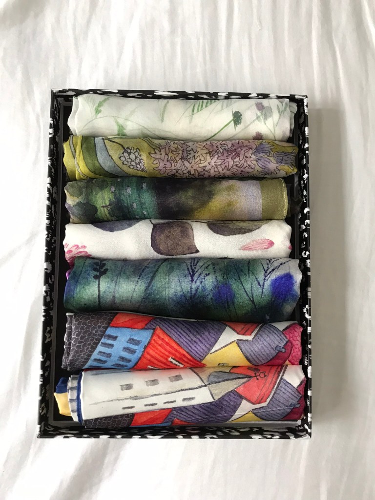 I was contacted through Instagram by a Chinese firm that offered to make some samples of my scarves in silk. It felt risky, but the investment for samples was not huge, so I decided to go ahead. When I received the first two samples, I was absolutely amazed. I could never have imagined that I could produce something of this quality. I still work with this firm and am very glad I decided to try back then. So, my little scarf business was sort of born by accident. 😊