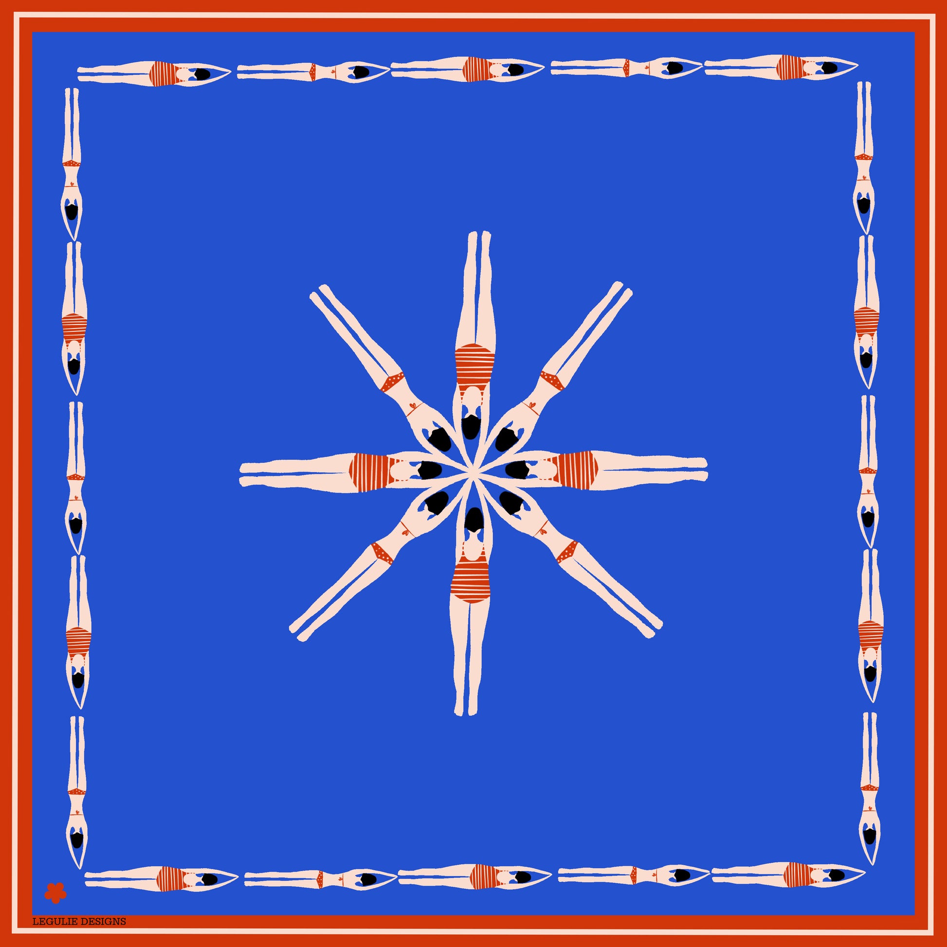 A swimmers French chic linocut inspired pattern printed on 100% silk twill fabrics.