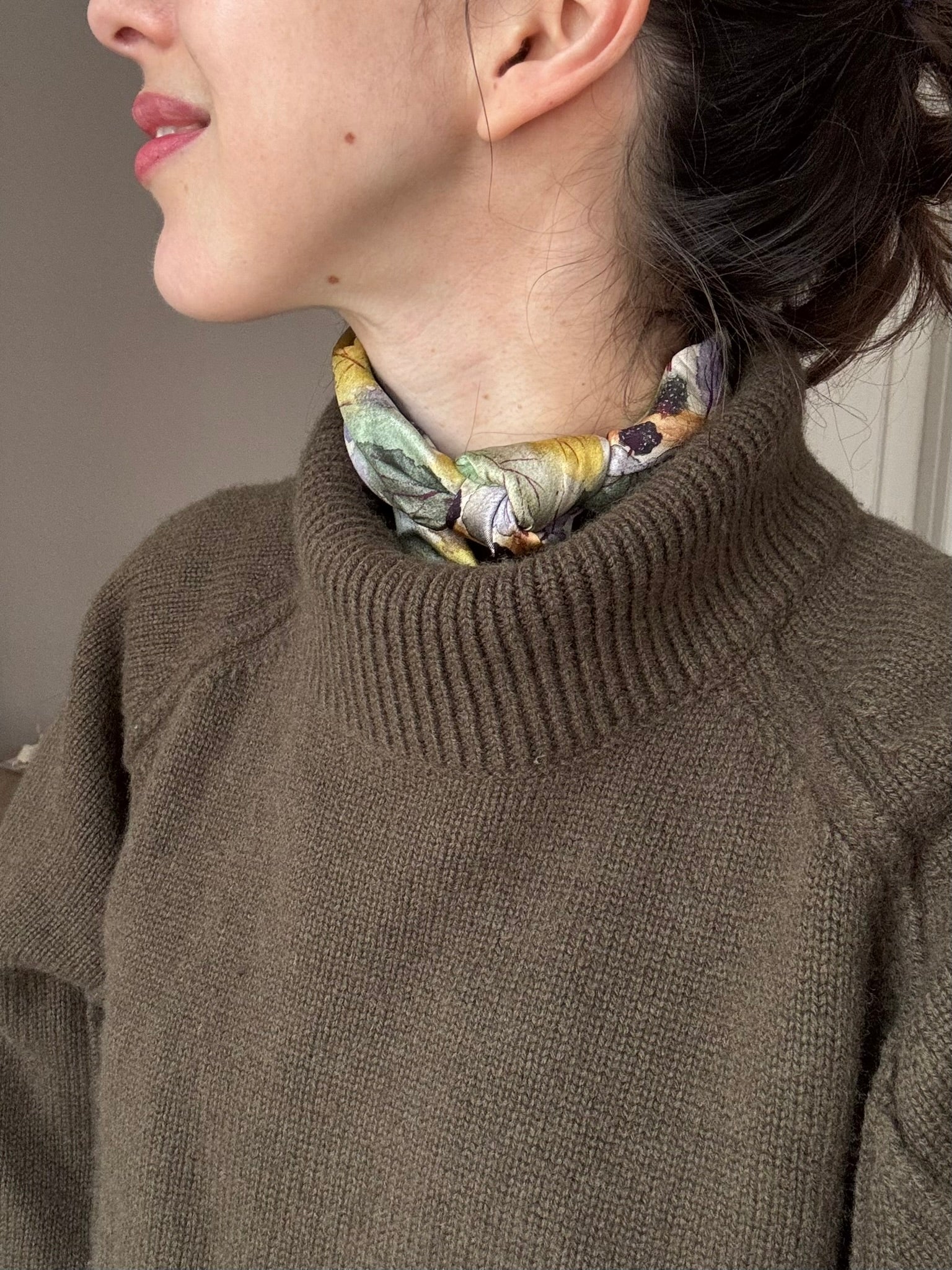 This 65 × 65 cm silk twill square scarf in the “Forest house” features a watercolor artwork in various shades of green with a little splash of warm yellow. Tie it as a neck scarf, hair accessory, bag accent, or tie it around your waist — it’s a versatile wardrobe essential.