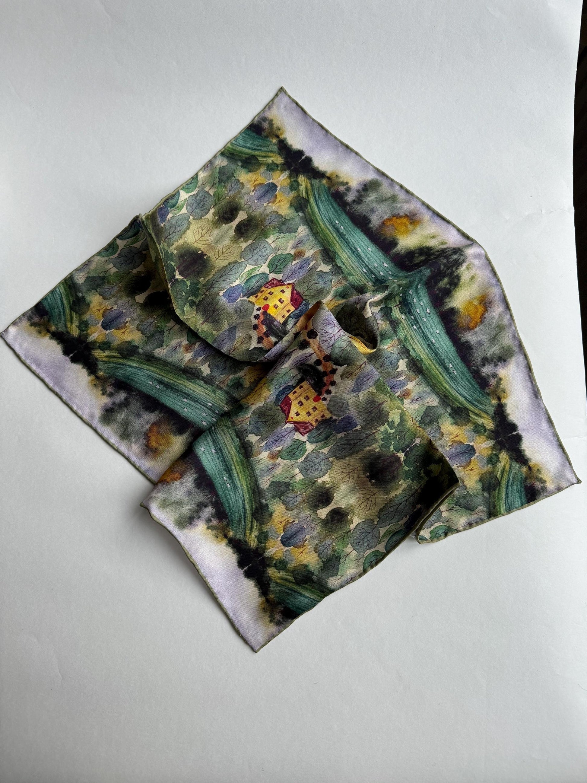 A small (43X43 cm) silk twill scarf in a pattern "Forest house” designed by Valeria Gulieva