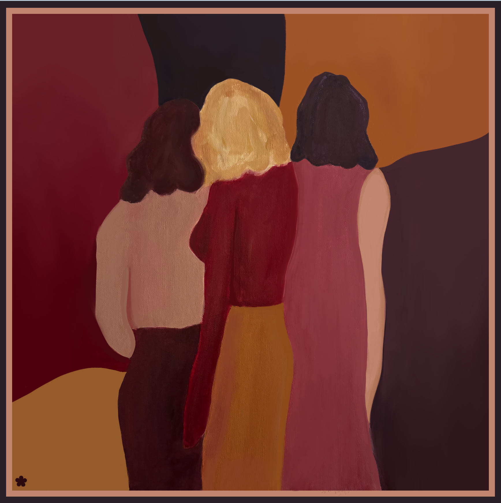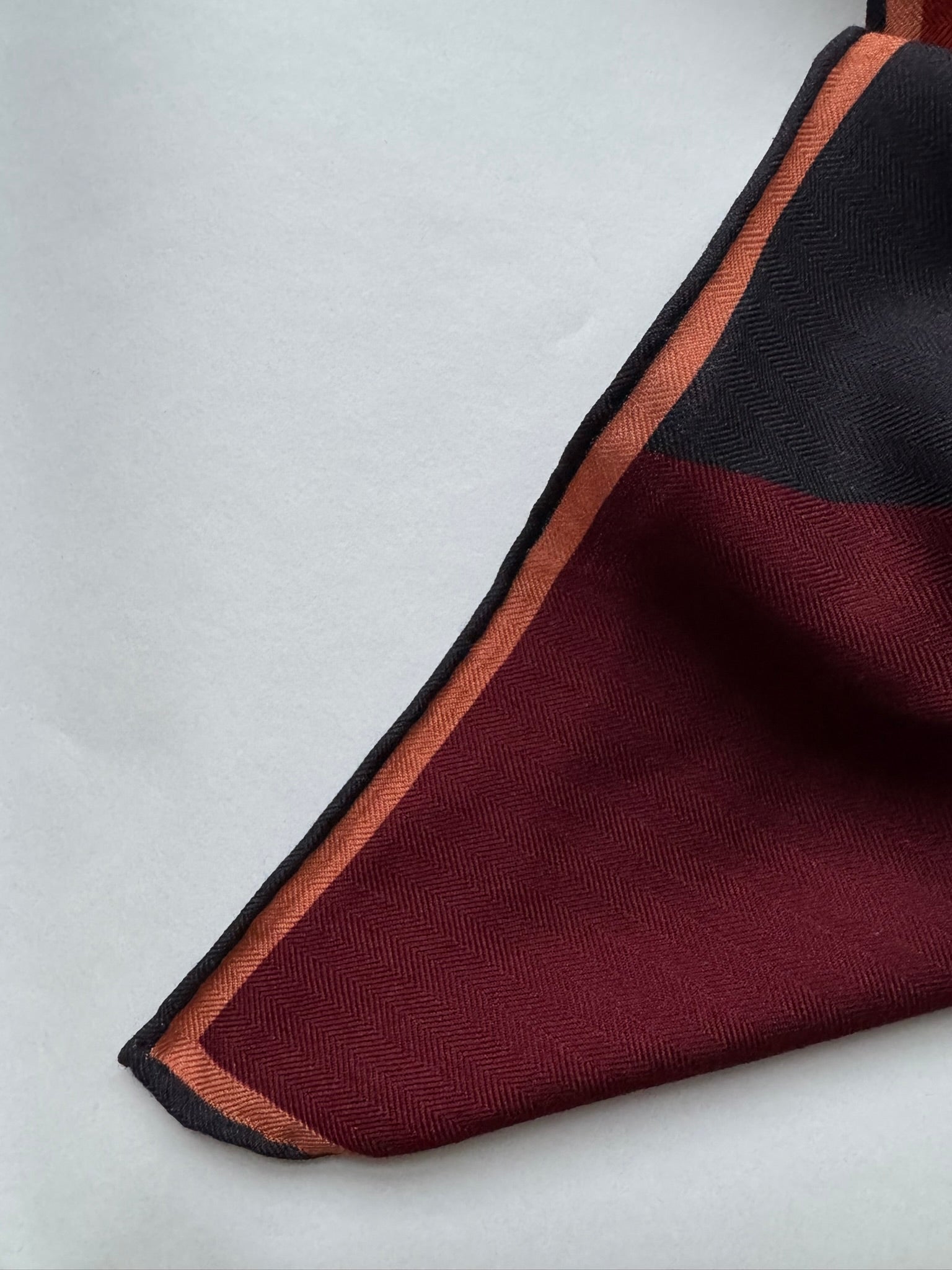 Meet “Ladies”, a wool–silk square scarf based on original oil painting of three women standing shoulder to shoulder. The design is almost abstract — fluid shapes and strong silhouettes blending into a rich palette of deep red, earthy brown, and golden mustard.