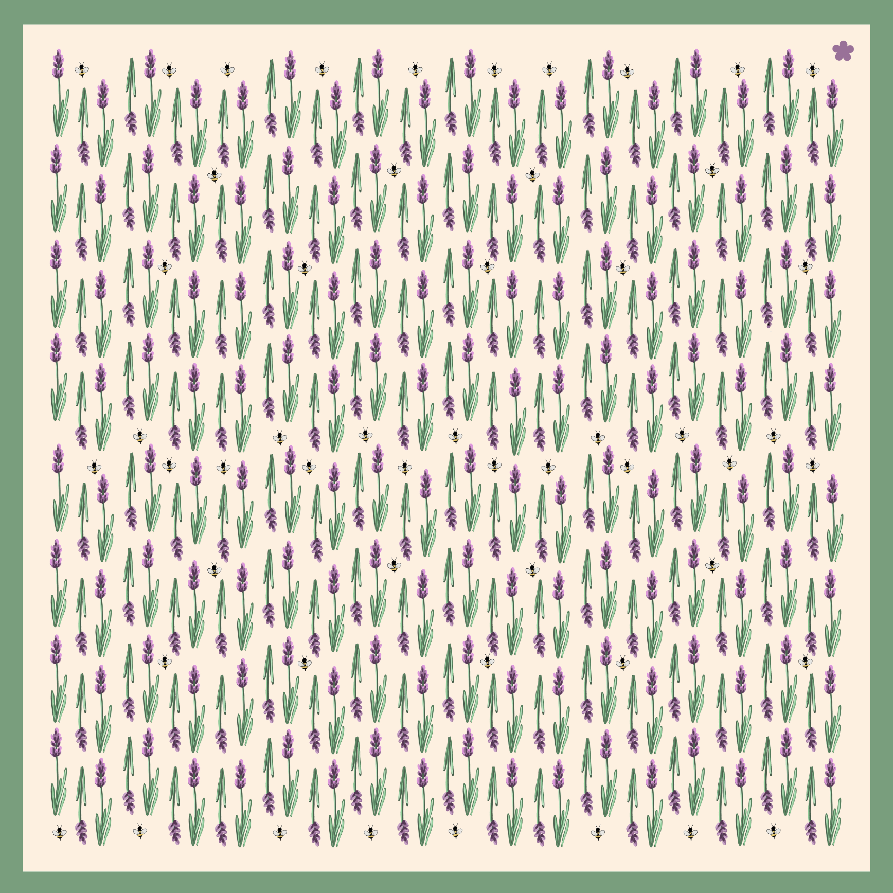 A smaller (65X65) silk twill scarf in a pattern "Lavender and bees” designed by Valeria Gulieva