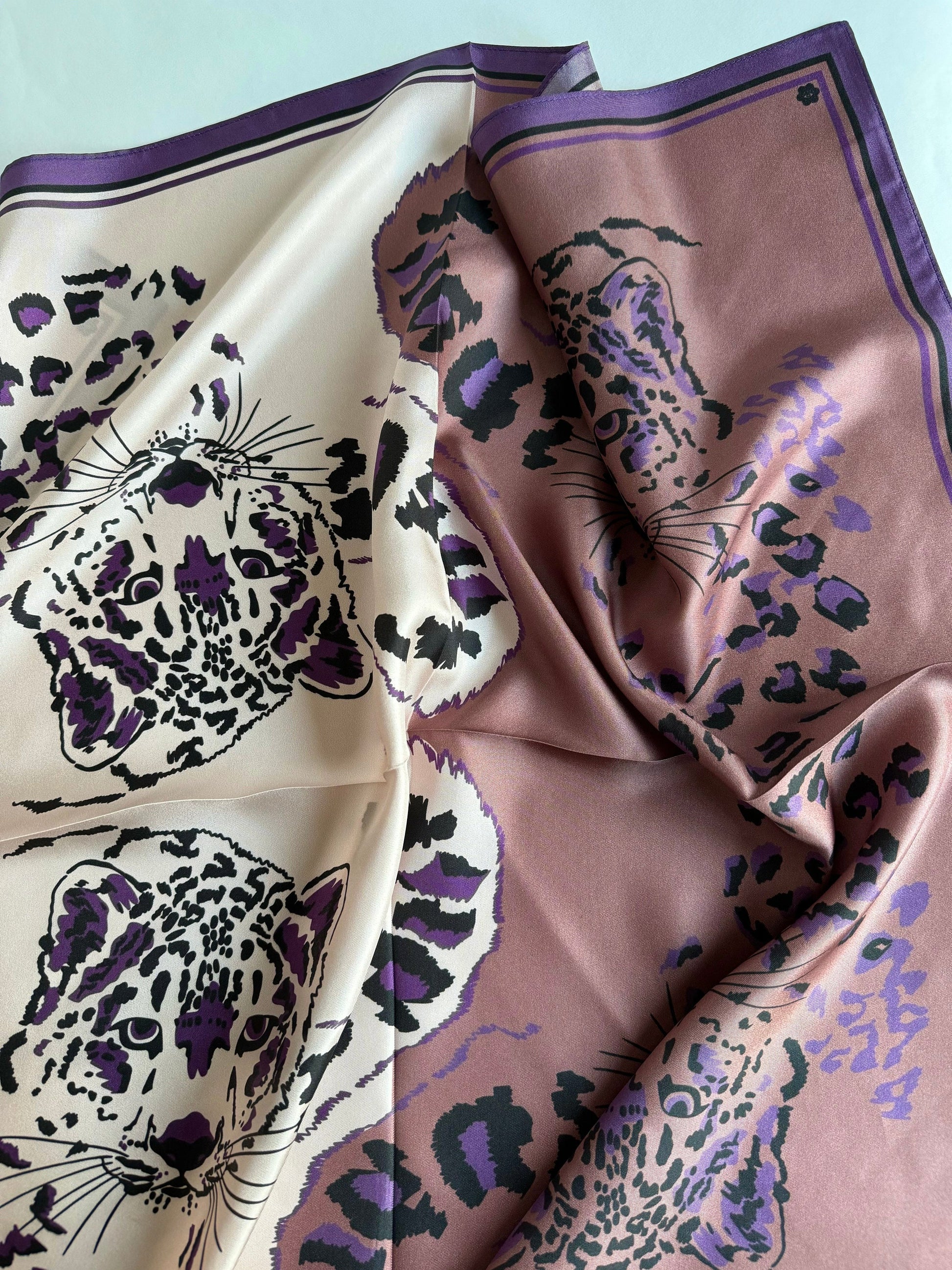A medium (65X65) silk twill scarf in a pattern "Snow leopard” designed by Valeria Gulieva