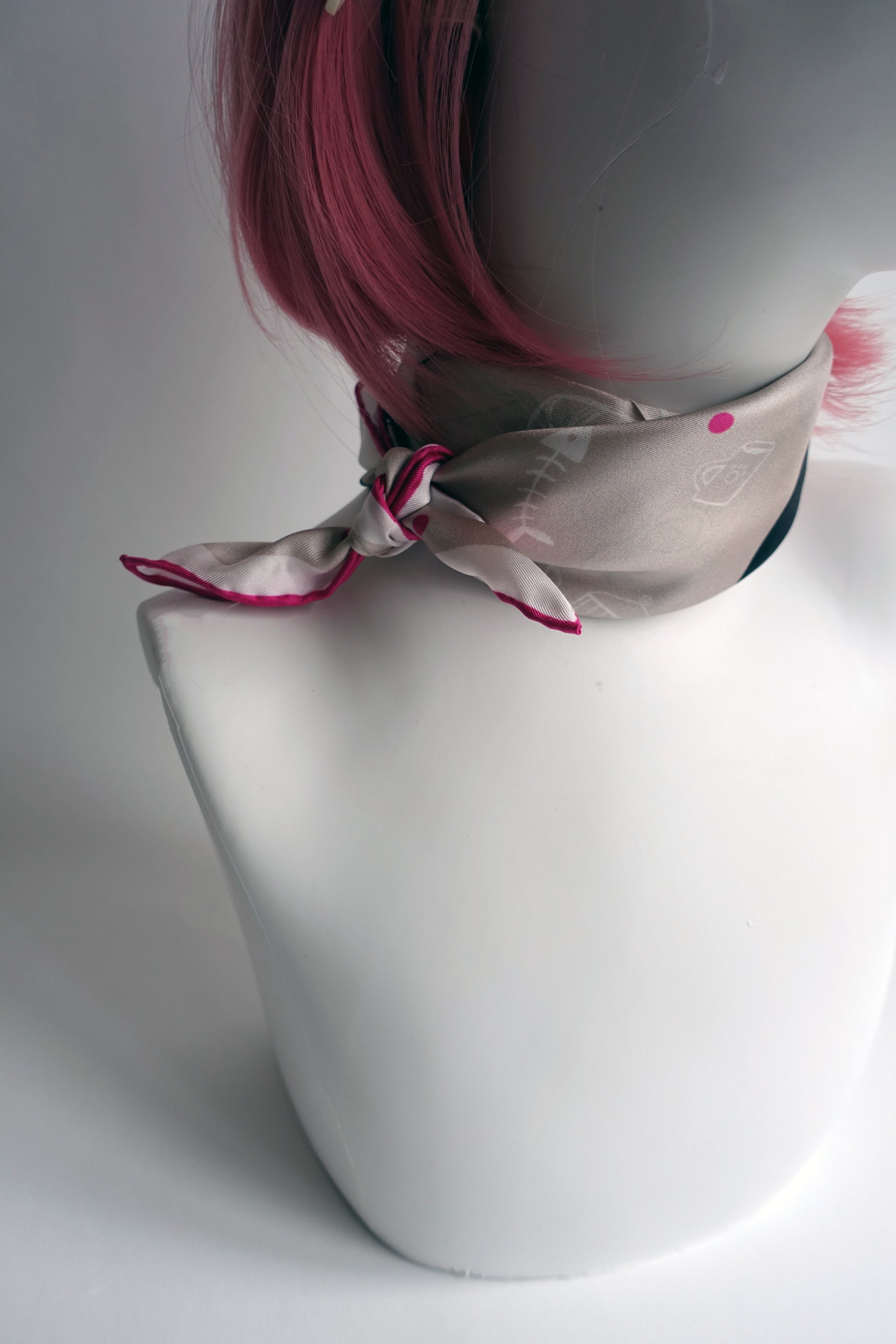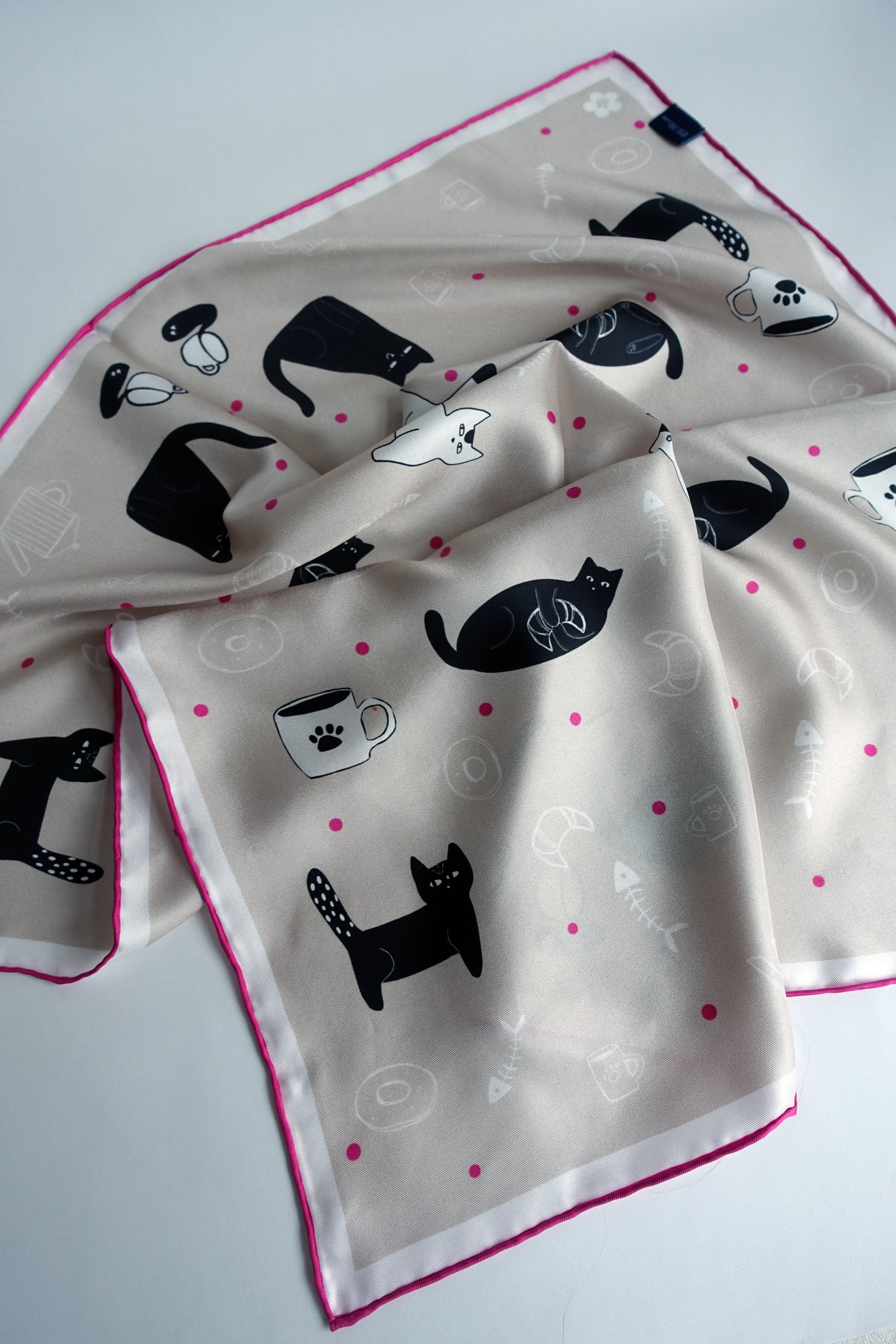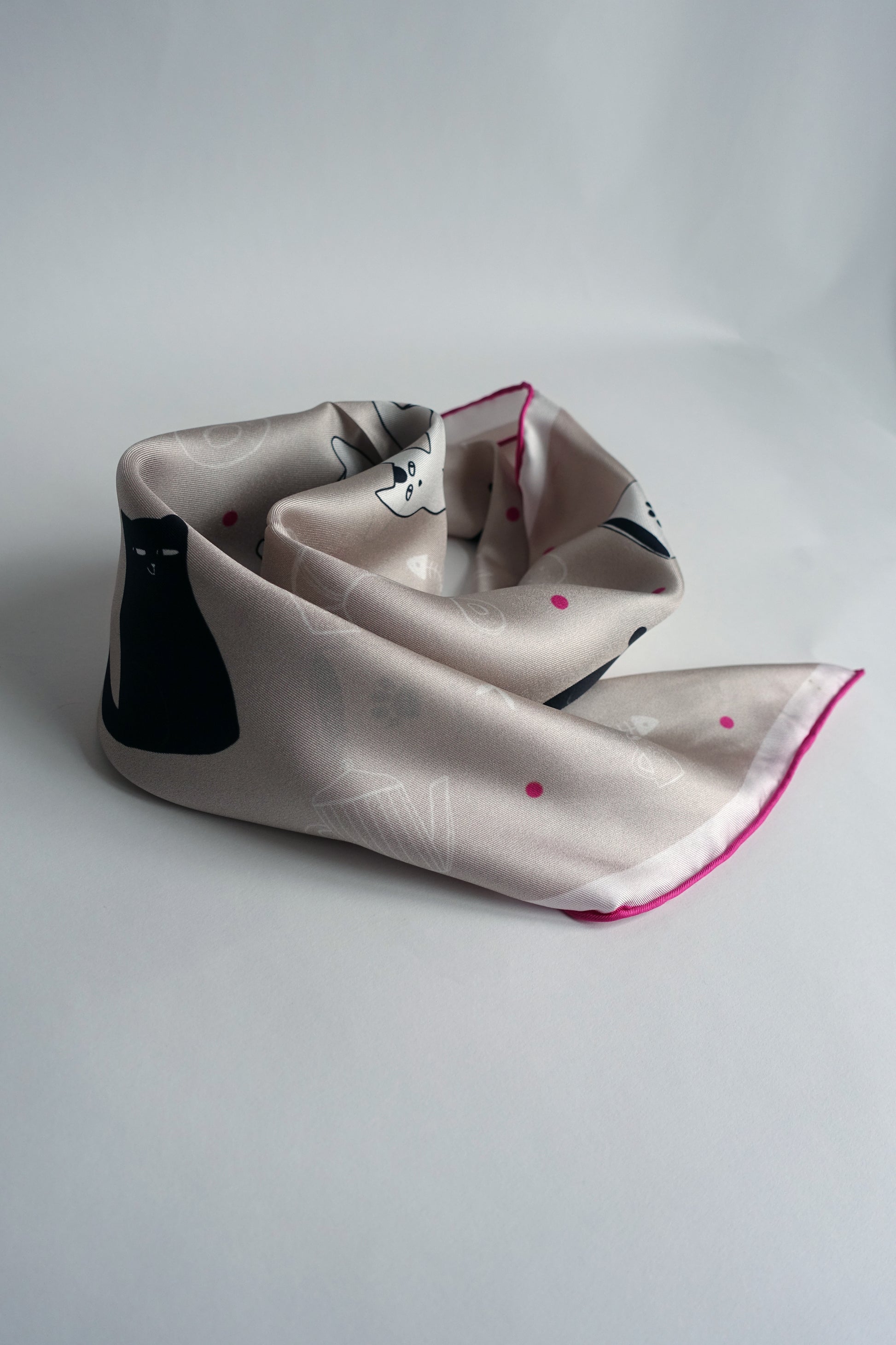 Set against a calm cream-beige base, playful black-and-white cats roam freely across the design. Some are sweet kittens. Others are real troublemakers, casually knocking things over on purpose — because, well… cat logic. A few fuchsia polka dots pop up across the design creating small bright accents, while the hand-rolled fuchsia edge frames the scarf with an unexpected, joyful twist.