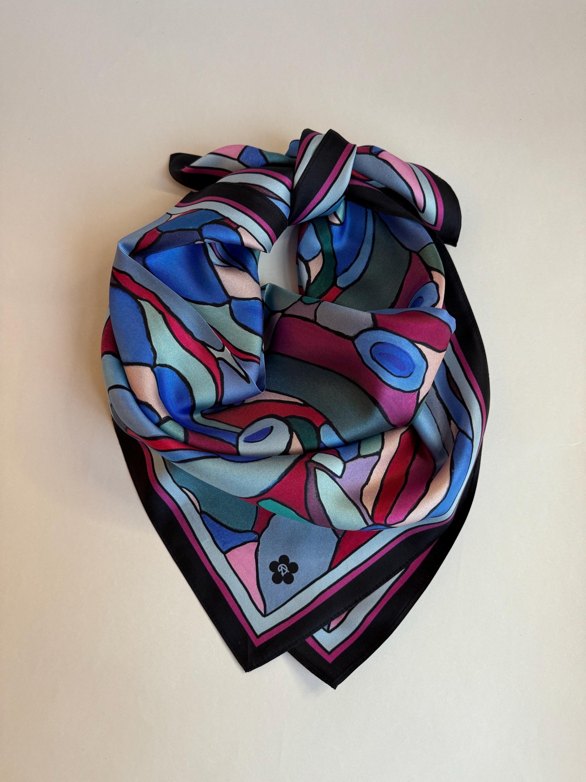 Bring bold elegance to any outfit with this 65 × 65 cm silk twill square scarf in the vibrant “Purple Bush” pattern. Inspired by bright leaves and berries, based on an original oil painting by Valeria Gulieva.