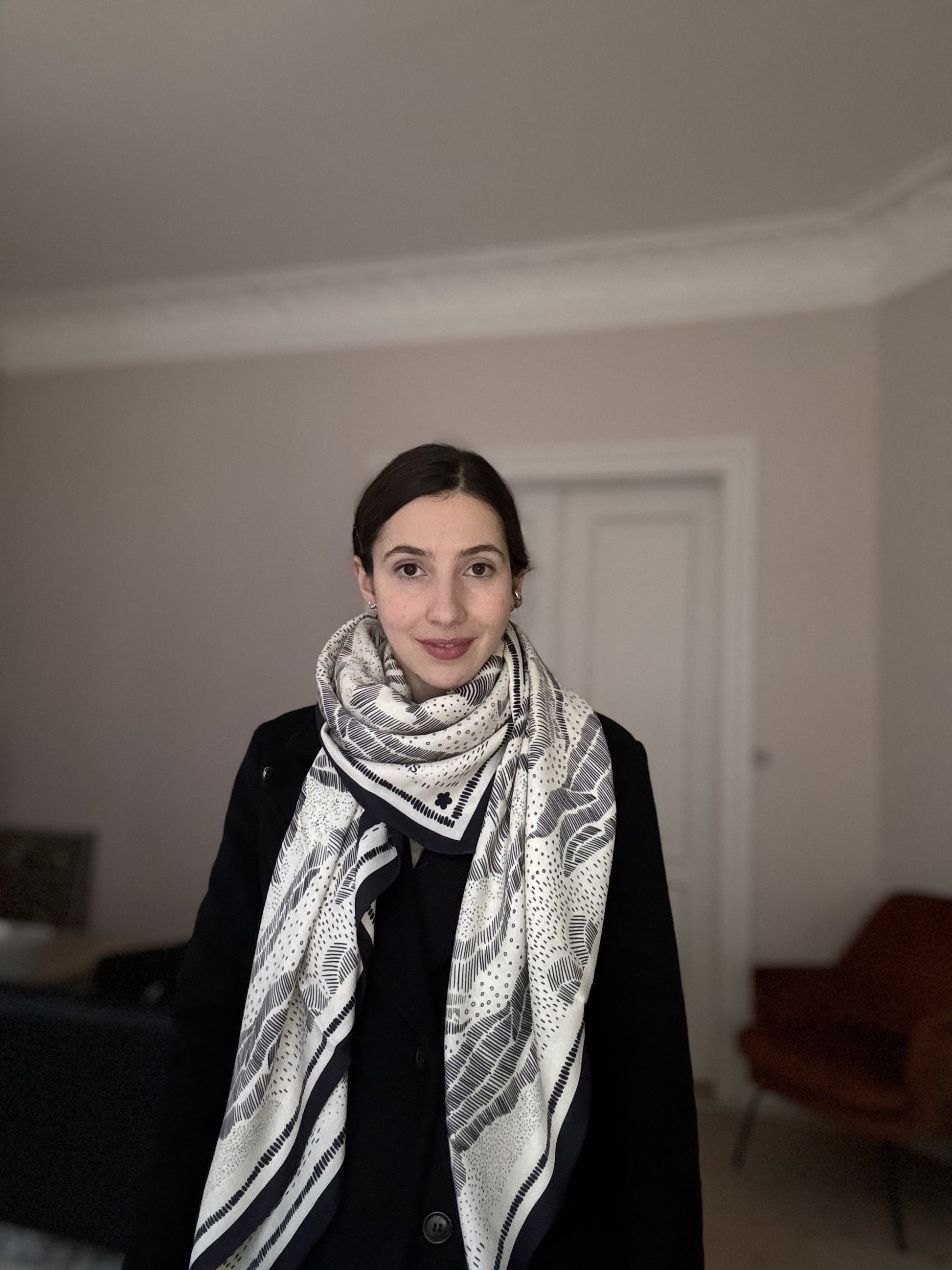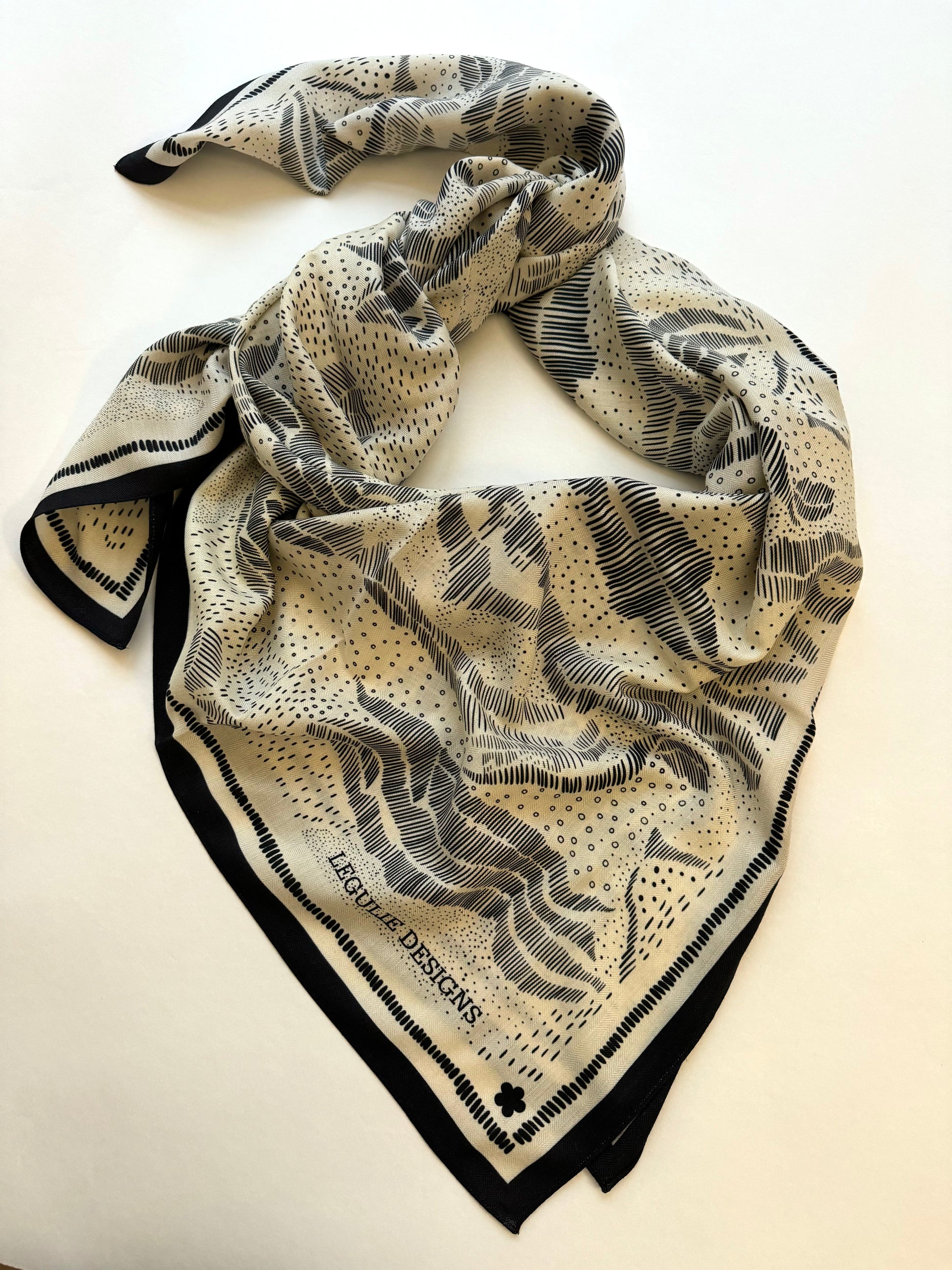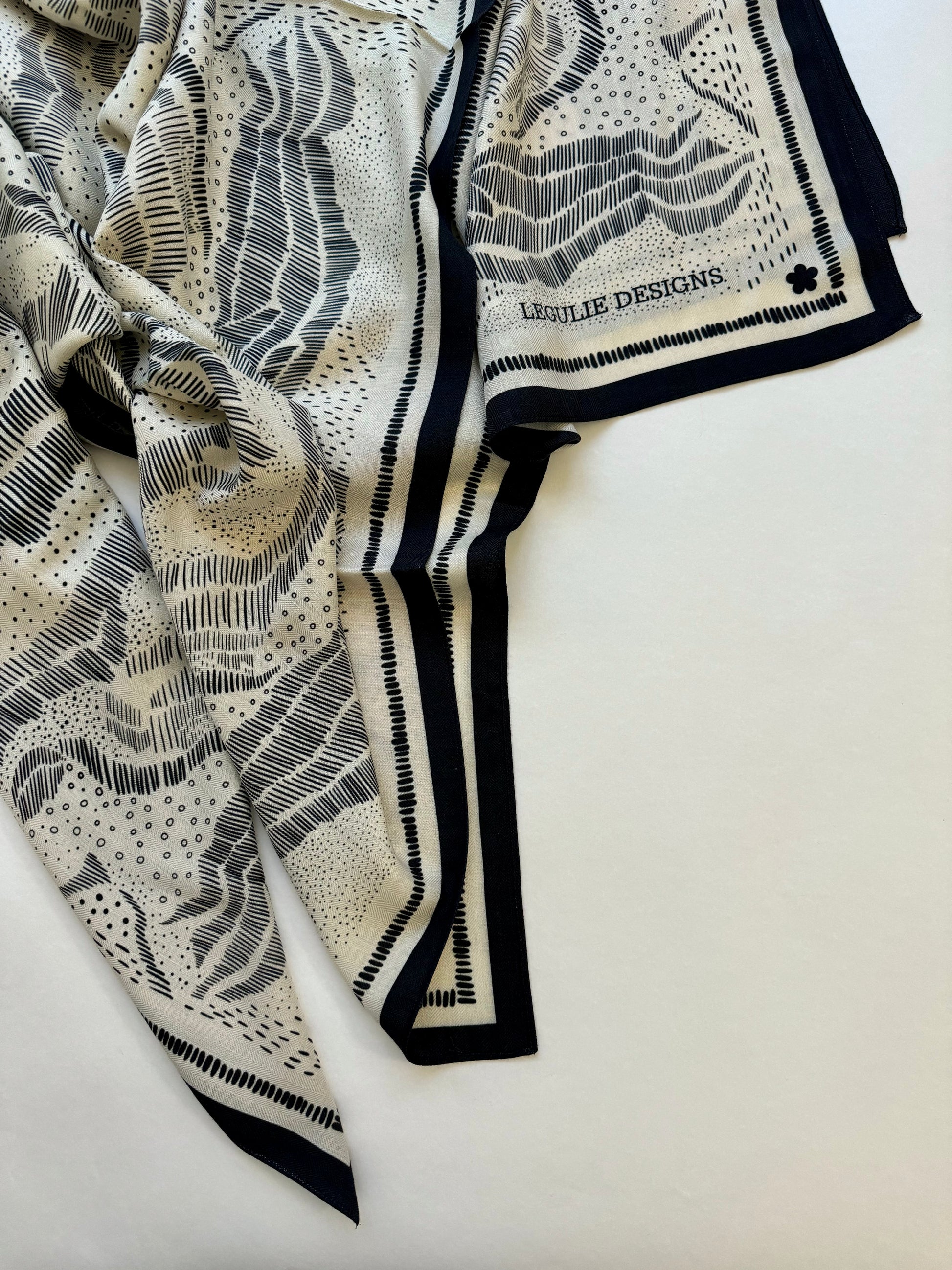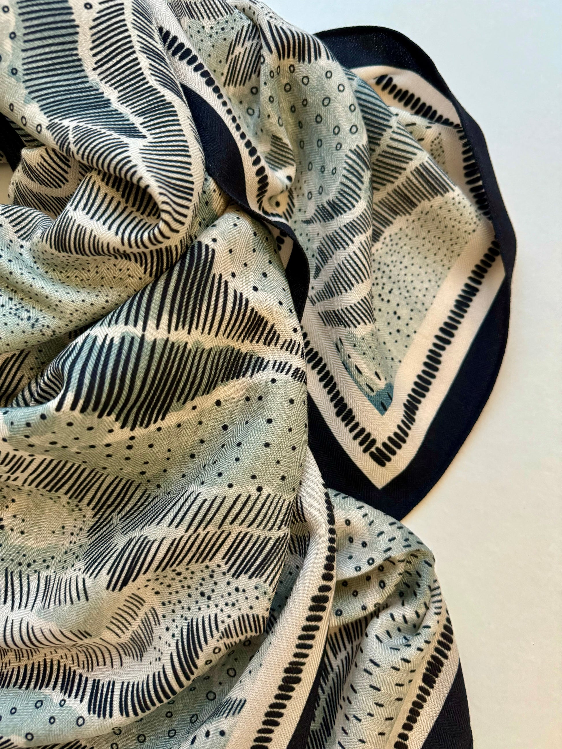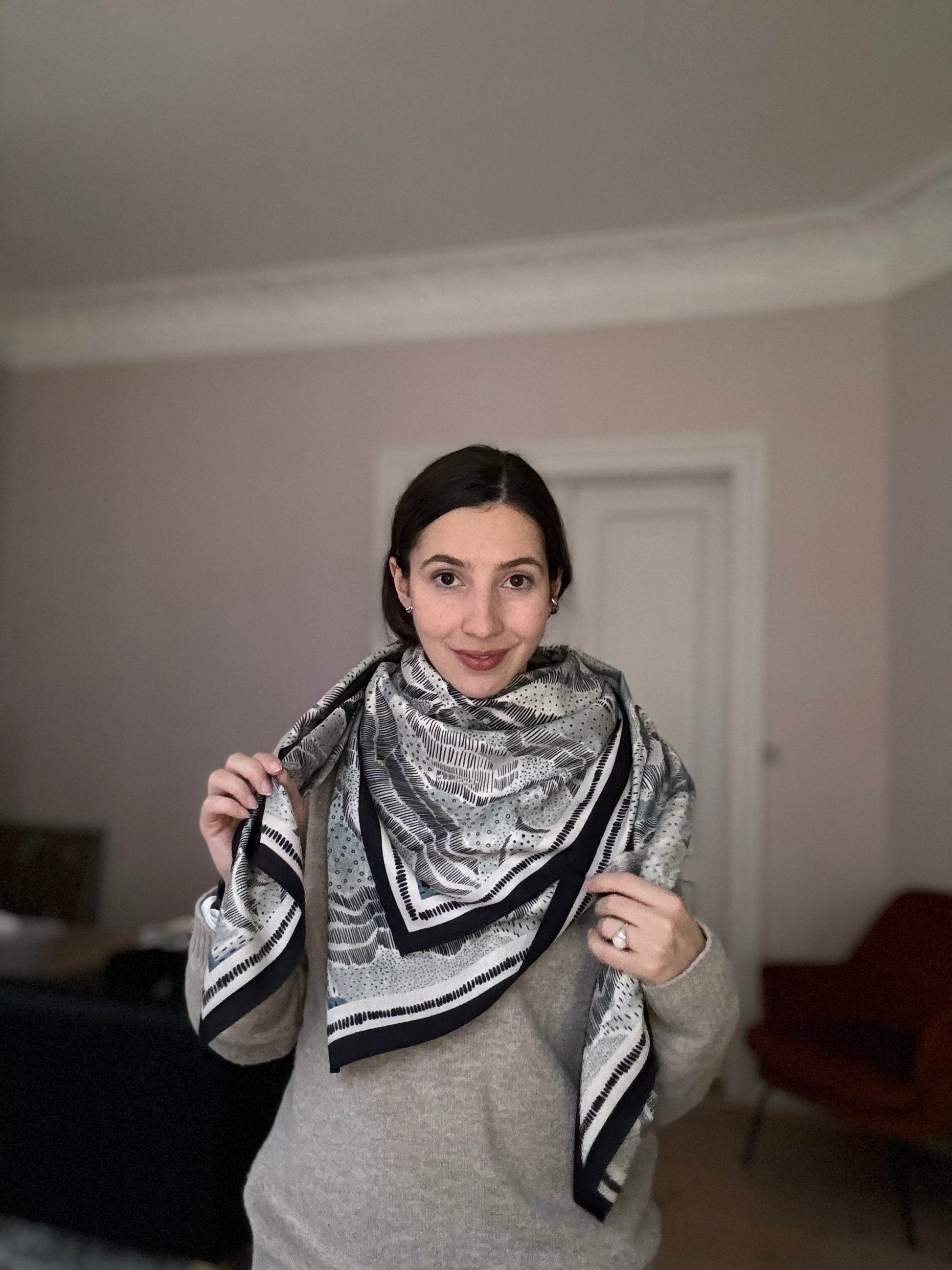 A big and lightweight warm hug for the winter season. Limited edition, unique pattern created by Valeria Gulieva. Double side print. Size 135x135 cm, 35% silk 65% wool. Available in two colors.