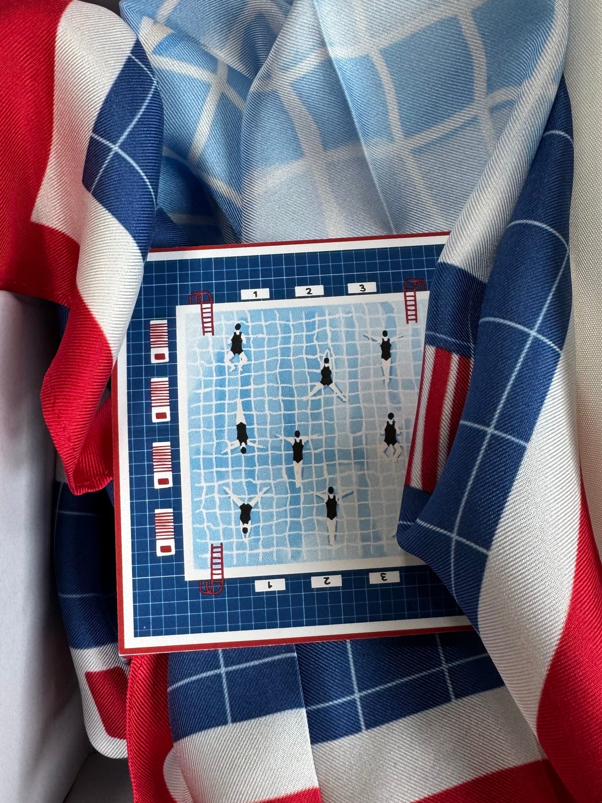 A simple yet playful design in light and dark blue tones—almost navy—with a bold pop of red along the edges. Classic meets fun!