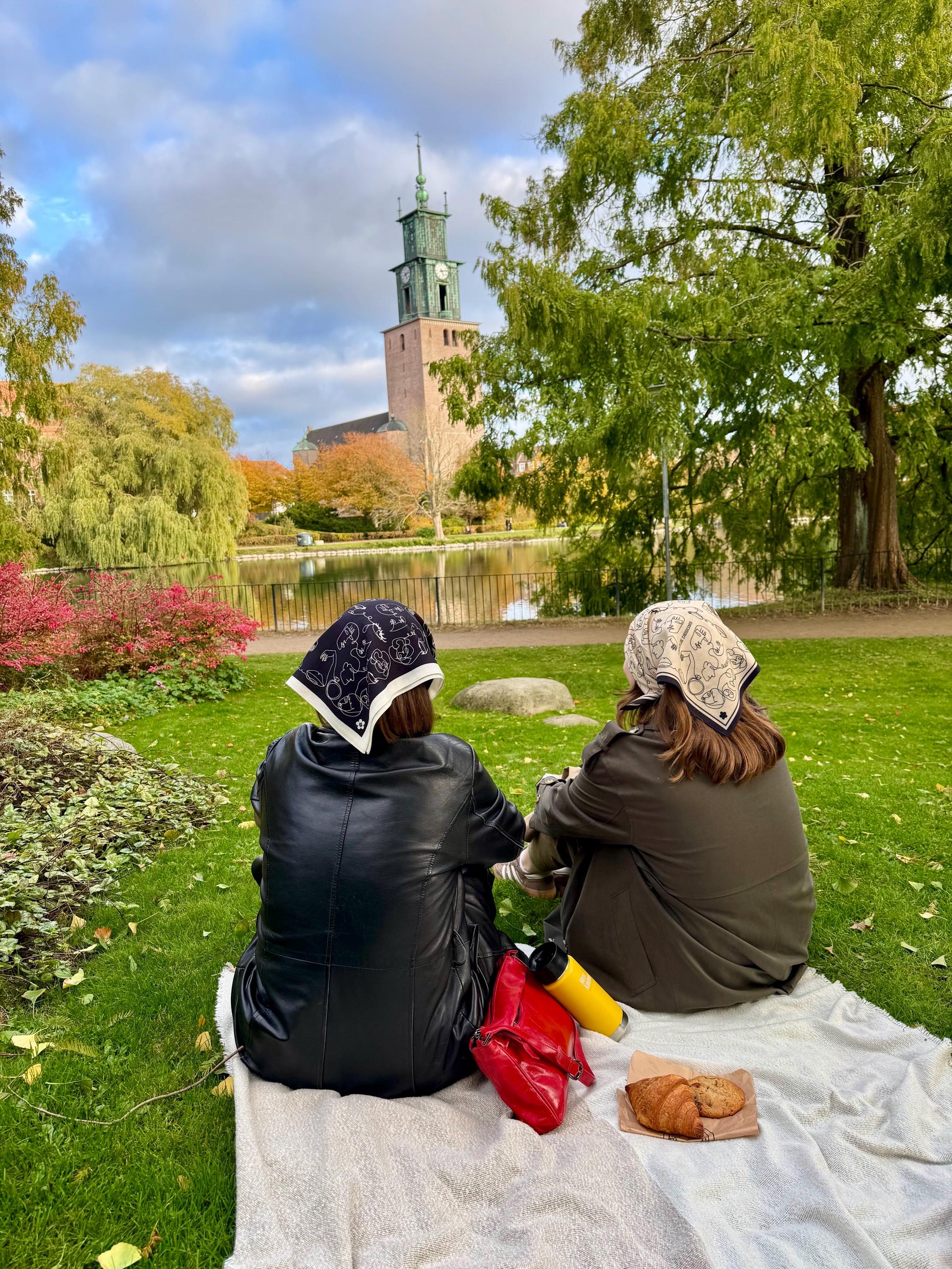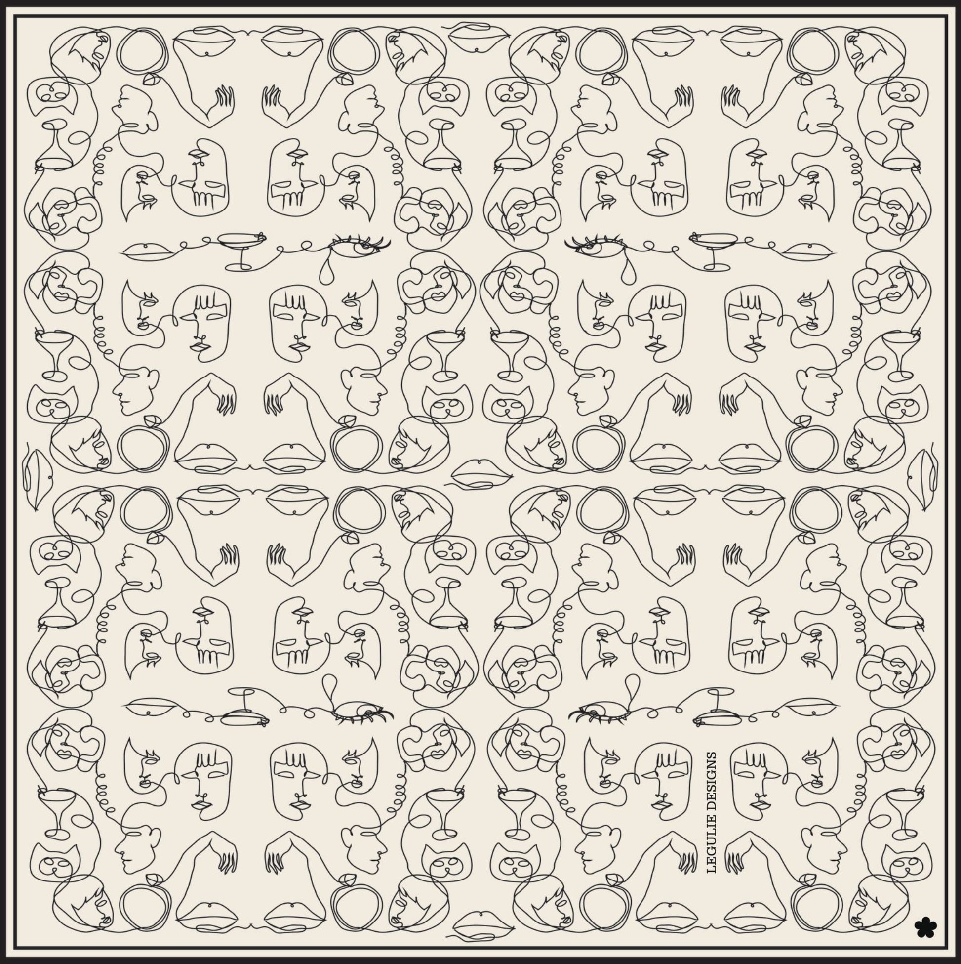 The “Gossip” scarf in warm beige captures the energy of a 1920s café scene — elegant, mysterious, and full of charm. The fluid line drawing of chatting women weaves across the silk–wool blend, creating a pattern that feels both timeless and daring.