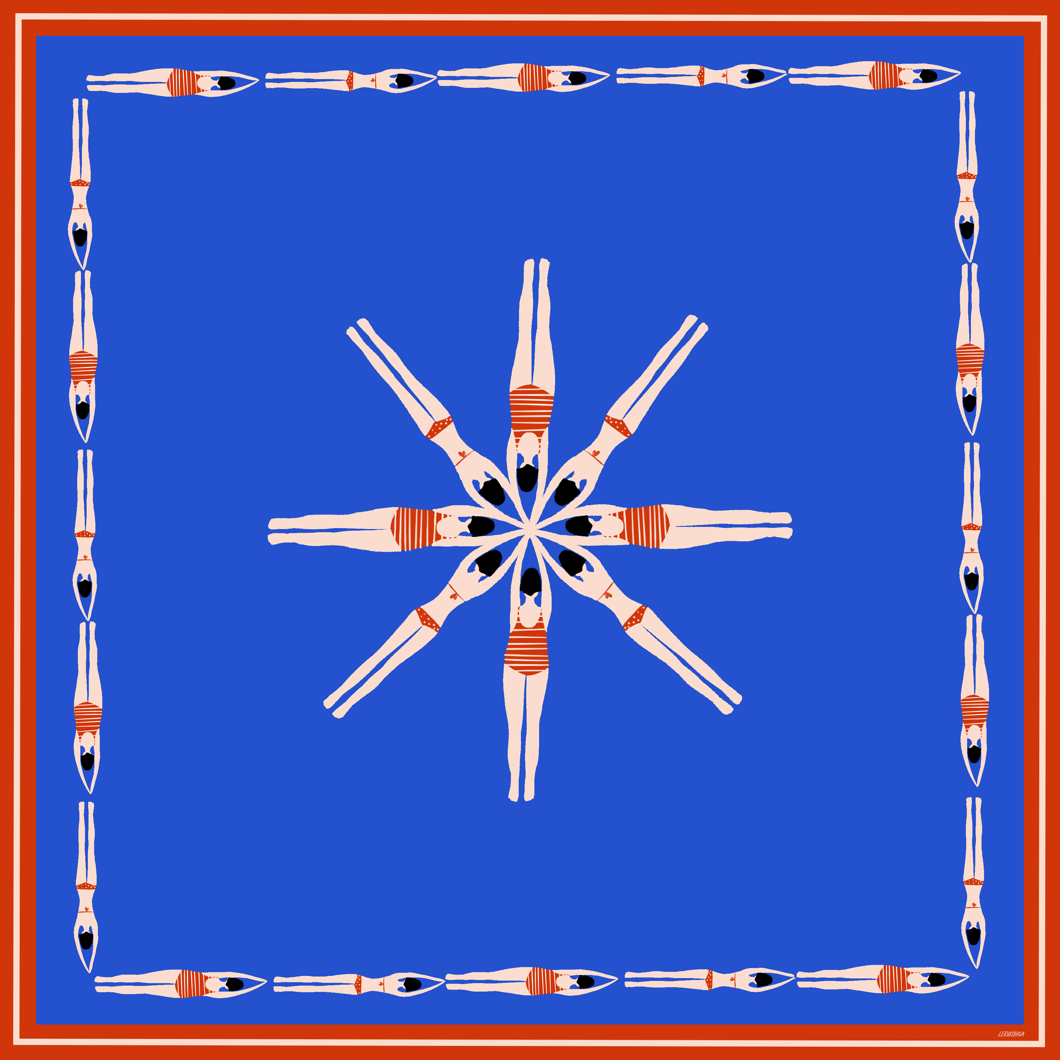 The Swimmers is probably my most recognizable—and best-selling—pattern. It originally started as a sketch for a linocut print, but I quickly saw its potential as a repeating design. I began with just two swimmer figures and spent a lot of time arranging them into a balanced, decorative layout.