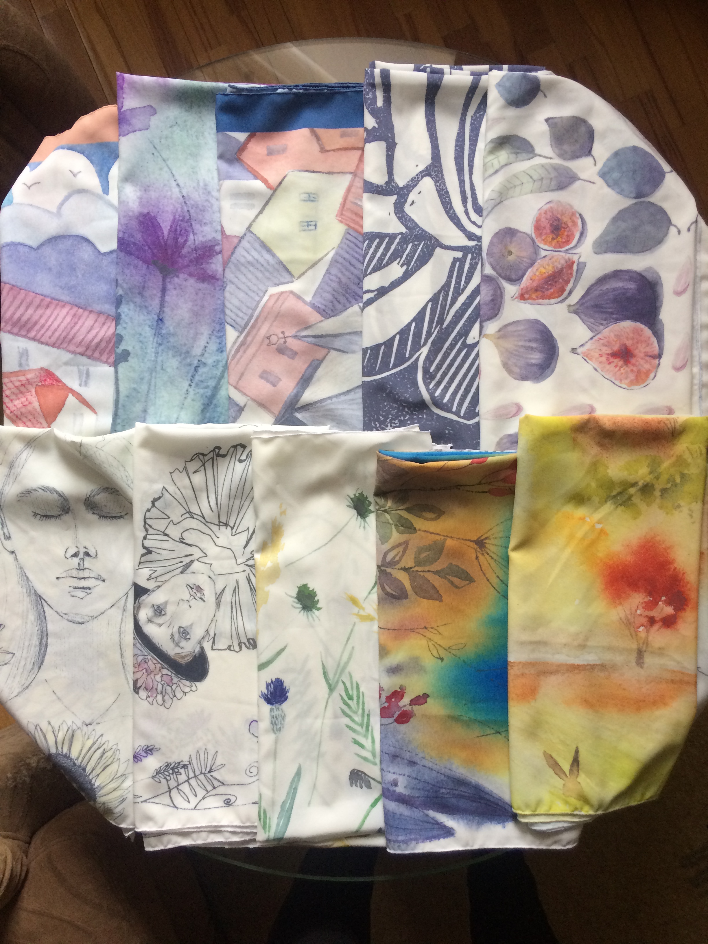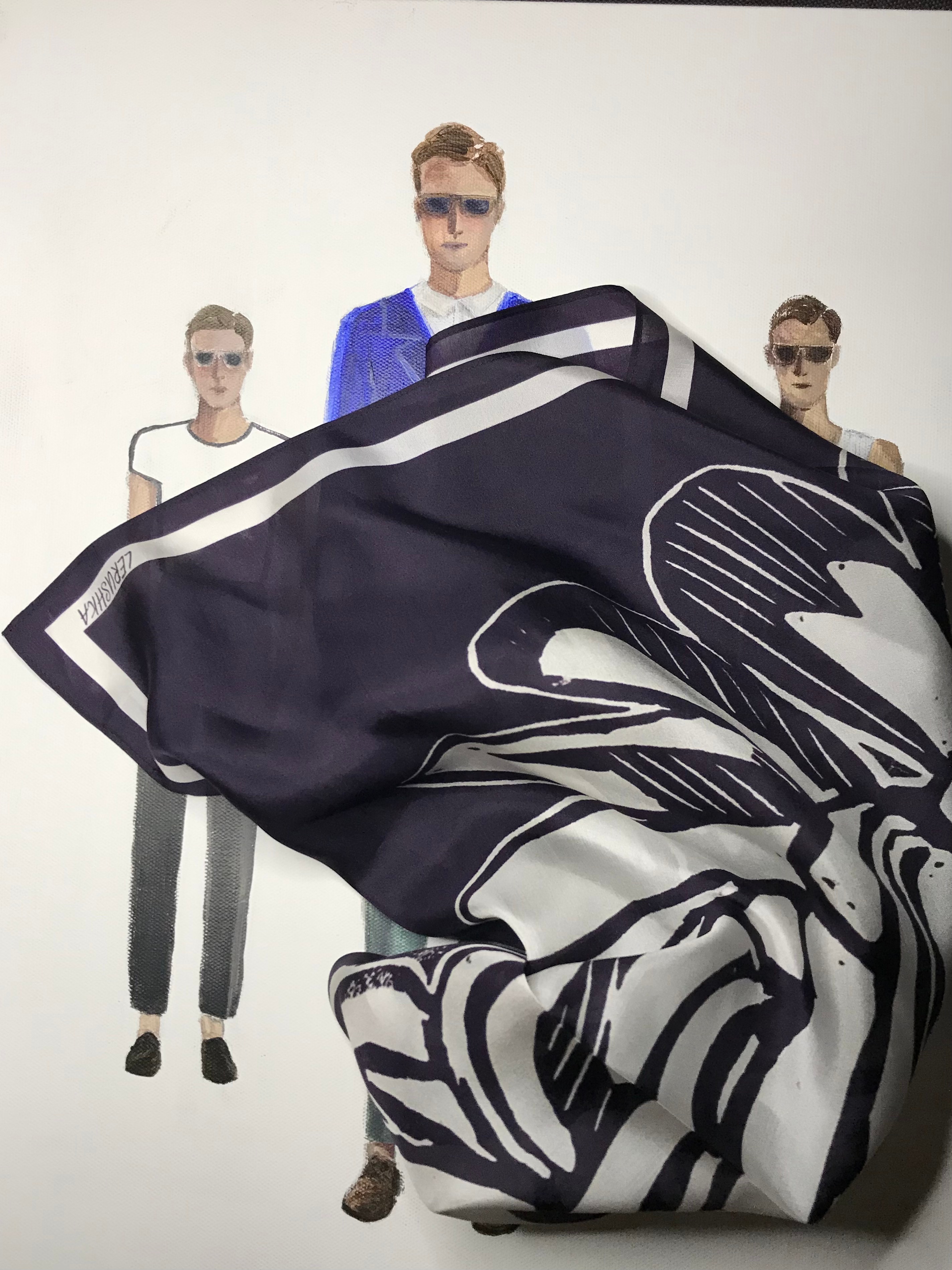 This design began as a watercolor painting. At first, I hadn’t intended it for a scarf, but I was drawn to the rhythm of the shapes and the warmth of terracotta orange. Scandinavia became one of the very first scarves I produced. It has gone through a few iterations: a close-up version featuring a fragment of the watercolor, and a refined update that features a repeated pattern. The current edition carries a crisp blue edge that frames the design beautifully.