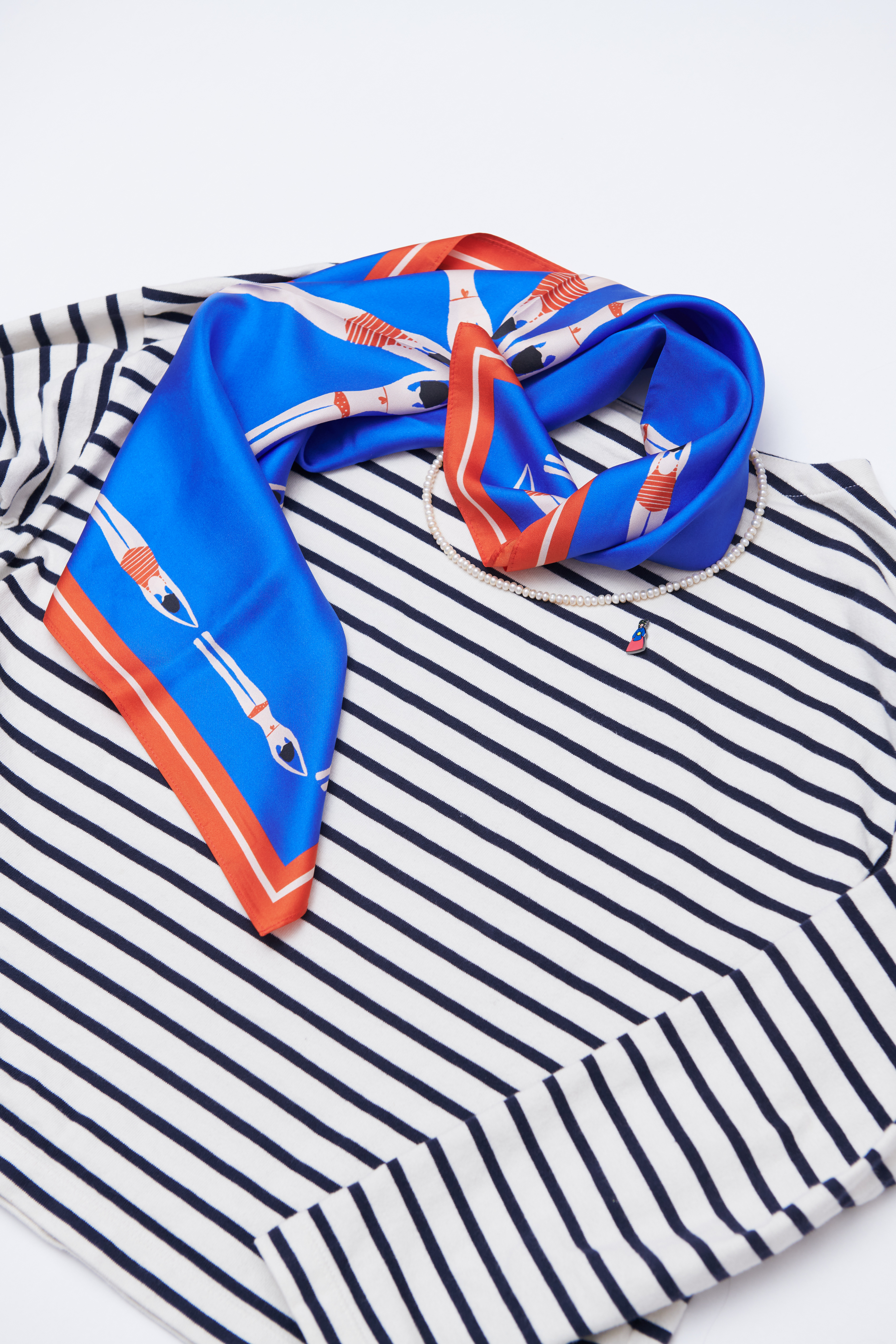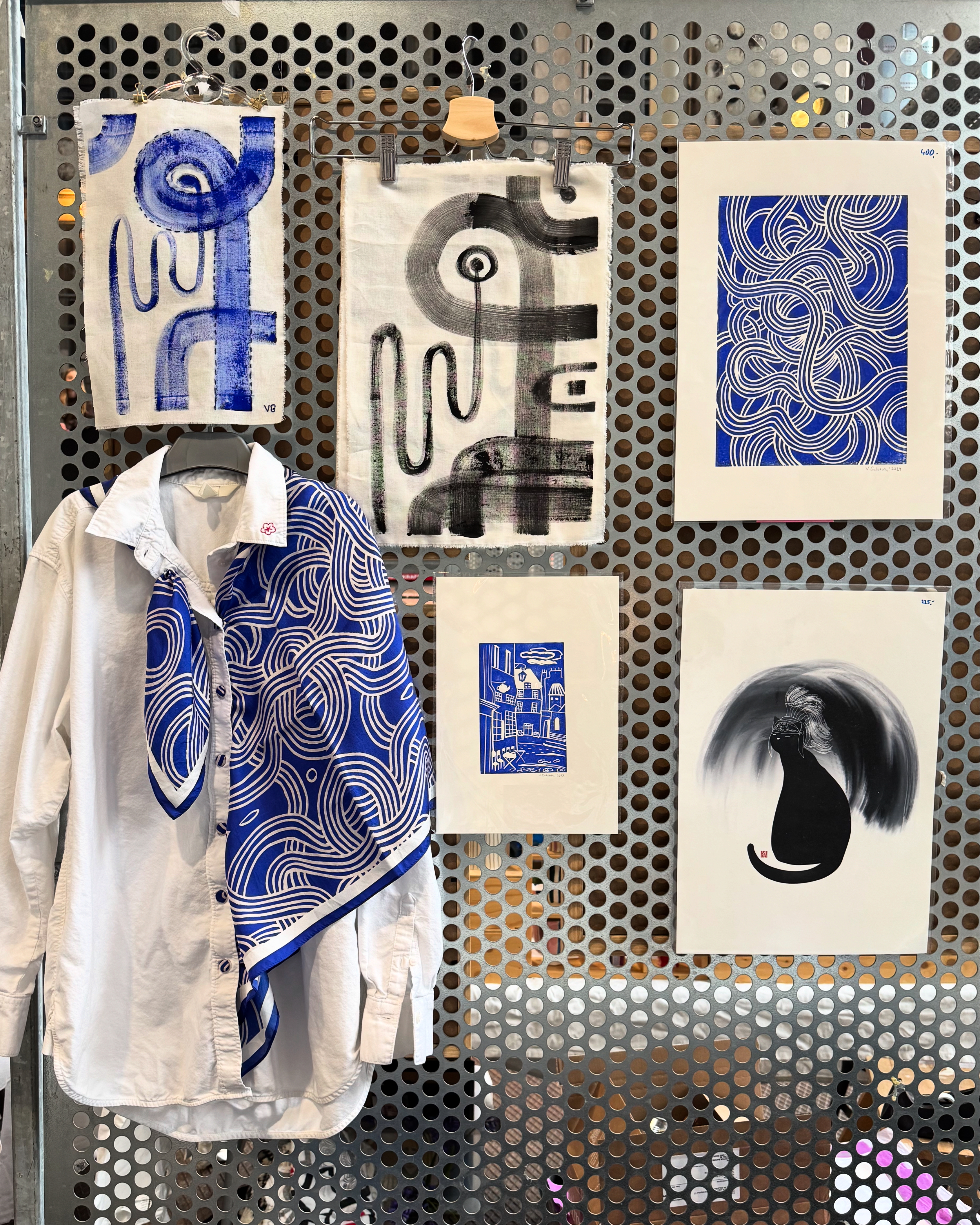 What makes this pattern special to me is the rhythm of the carved strokes and the depth of the Ultramarine ink by Winsor & Newton that I used for the original artwork. The bold, vibrant color carries the energy of the hand-printed texture, giving the design a unique character. In 2025, the Ramen scarf will be released in a large 90cm version with a hand-rolled edge—adding a touch of craftsmanship and making it feel even more distinctive.