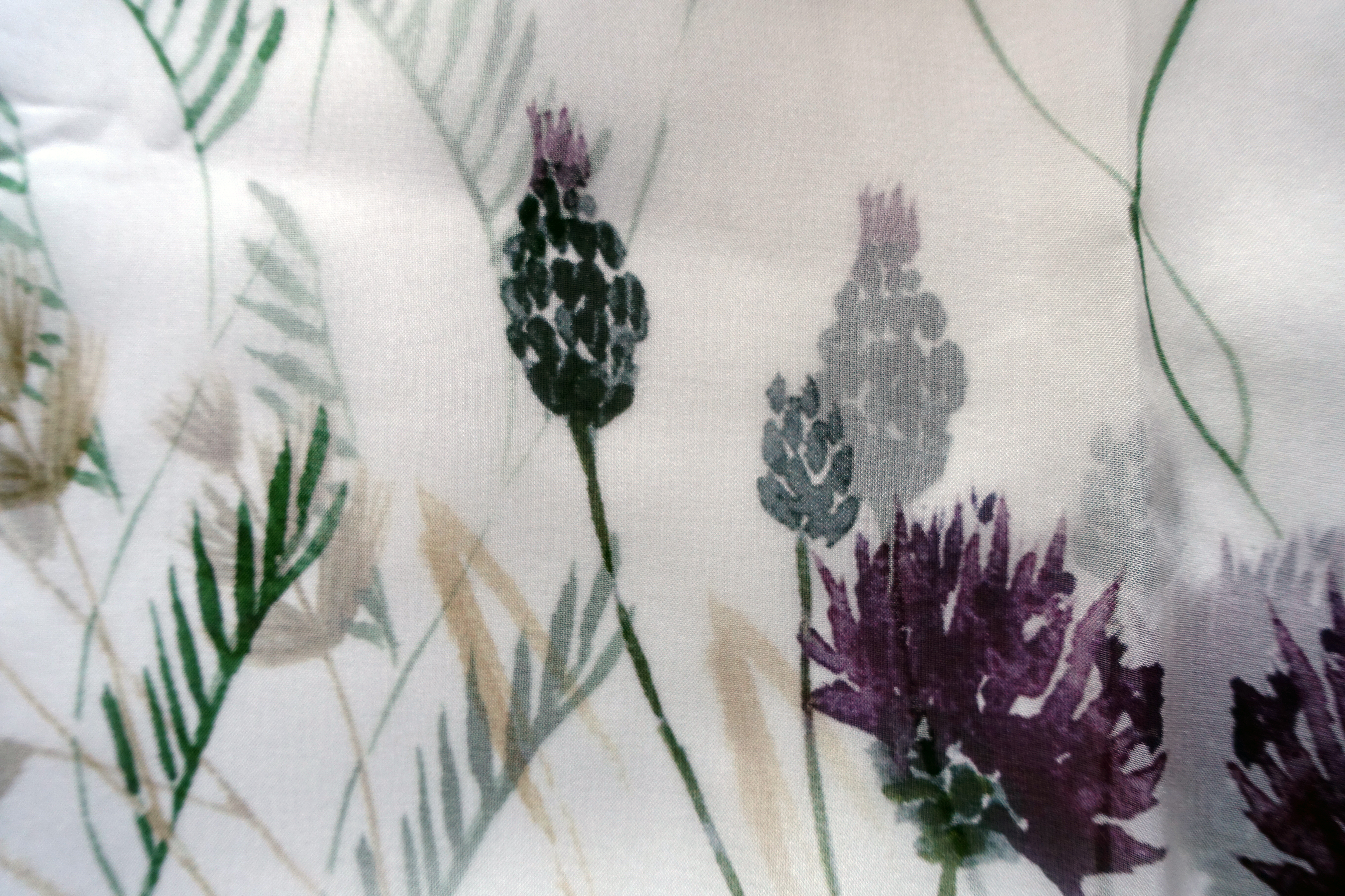 Mulberry Silk Twill (14–16 mm). Smooth and durable silk with a soft sheen and clear print definition. Suitable for year-round wear and detailed patterns.